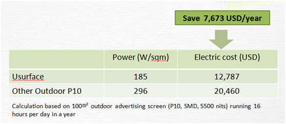 Usurface’s aluminum cabinet is with fan-less design, unique circuit design, more energy efficient. It reduces 40% power consumption compared to common outdoor LED displays.