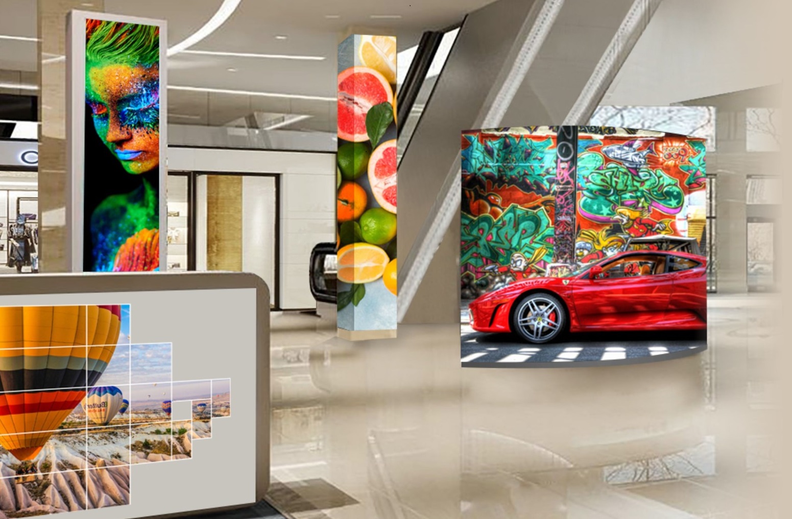 Here we propose you unleash your creativity and be free to make your own unique LED display that fits your unique place and application scenario. Cabinets have three different dimensions and can be spliced with each other vertically, horizontally and in shifted way. That goes along with curved and right angle splicing. Special integration with UHF series allows you to create all thinkable and unthinkable forms from traditional waves and circles to eye-catching media projects to bizarre futuristic visual art.