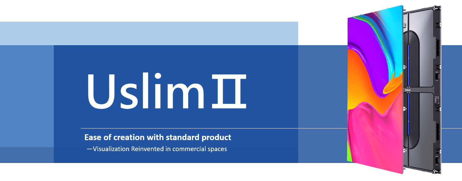 Recently Unilumin presented our new product - the second generation of Uslim series display for commercial use. The main target achieved with this innovative LED solution is extended flexibility that allows variation of creative shapes and forms in all kinds of different ways. Now, creative shapes are available in rather much quicker and easier way, because of the ready-made standardized fix installation display. This core value is reflected in product's slogan: "Ease of creation with standard product - Visualization Reinvented in commercial spaces".