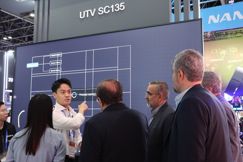 To the left of the ULWⅢ MIP stood another crowd favorite—the UTV SC series in touchscreen version, Unilumin’s best-selling All-in-one LED display. Renowned for its ultra-high-definition performance, multi-functional versatility (such as smooth touchscreen and freely white screen writing features are extremely popular to customers), and exceptional power efficiency, the UTV SC continues to dominate markets across the globe. Its seamless integration and plug-and-play convenience make it a top choice for both corporate and educational environments.