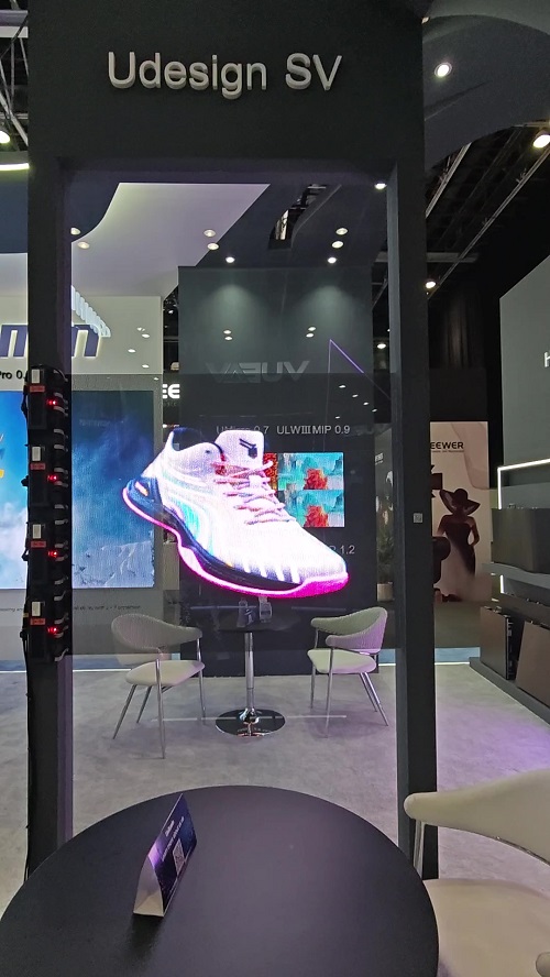 But innovation didn’t stop there. The Udesign SV transparent display played a key role in attracting foot traffic to the booth. With up to 95% transparency when idle and a stunning holographic-like effect when activated, it offered a futuristic viewing experience without compromising the visibility of the background space. Visitors were quick to capture the magic on their phones, turning this display into a social media sensation.